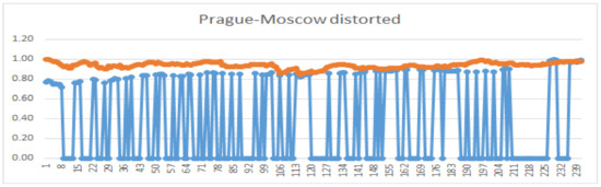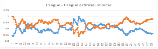 To see whether the similarity index (26) reacts on very dissimilar time series, we artificially distorted the Moscow market and also artificially inverted the Prague market’s price values. The comparison (Prague–Moscow distorted) and (Prague–Prague inverted) is in Figure 7 and Figure 8. As one expects, there is zero similarity between Prague and distorted Moscow. However, the similarity between Prague and its inverted version remained non-zero, which is caused mainly by the found similarities between their corresponding slopes.