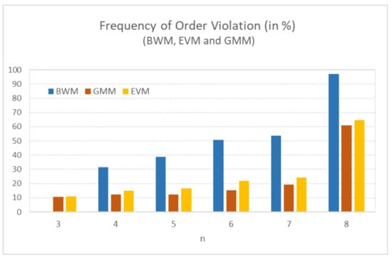 As for order violation, its occurrence increased for all three methods as the matrix size n increased. In the case of , the order violation occurrence was more likely (above 50%) than not, and in the case of the BWM, it was almost certain to happen (above 97%). This result for means that even the smallest possible deviation (or error) in one pairwise comparison on the input leads to a different ranking of objects in more than 50% cases. It is likely that for greater matrix sizes, this phenomenon will happen even more often; this therefore implies that the robustness of rankings of objects derived from pairwise comparisons by the BWM, EVM, and GMM is rather low, and the decision maker should take this into account. Differences in order violation occurrence (considered to be a binomial variable where either order violation happened or not) between all three methods were again tested for statistical significance. The null hypothesis that there is no difference between the BWM and GMM, and the BWM and EVM, was rejected at for all n. Differences between the GMM and EVM were statistically significant at the level for , but not statistically significant at for .