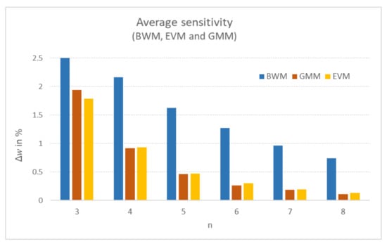 Table 1 provides the average values of sensitivity along with standard deviations and the frequency of the order violation. As can be seen, the least sensitive (thus, the most robust) method was the GMM followed by the EVM. The Best–Worst method performed significantly worse. In the case of order violation, again, the GMM performed best and the BWM worst.