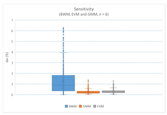 The sensitivity expresses, in a percentage, a per-weight change in the original priority vector w. If, for instance, , this means that each component of the original weight vector changed by 2% on average when the GMM was applied.