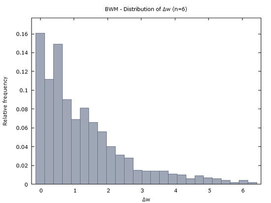 The appeal of the BWM lies in its obvious simplicity; however, until now, numerical comparisons of the BWM with other methods, the GMM and EVM (AHP) in particular, have rarely been covered in the literature. The studies of Ajrina et al. [19] and Haseli et al. [20] compared the BWM and the AHP via one and two numerical examples, respectively. The original paper on the BWM [12] provided a comparison of the results of the BWM with the AHP in only one particular example based on an experiment with 46 respondents (university undergraduate students) and 322 PC matrices (and pairs of vectors) of the order . The work came to the conclusion that the BWM performs better than the AHP, and the weights derived by the BWM are highly reliable. Other comparison studies of the BWM and AHP/GMM are not known to the authors.