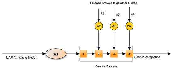 However, we should admit that the model discussed can be further extended to cover much more general arrival and service pattern—for example, marked Markovian arrival processes or even batch Markovian arrival processes (batch arrivals) and phase-type service. However, the phase-type service is not appropriate because, in transport systems, there are rarely backward stage transitions. In the following sentences, the restriction of the model analyzed is summarized. The arrival process to the first node is a fairly general process, namely Markovian arrival process ; for arrivals to the remaining nodes, we could have also made this assumption; however, it results in a tremendous increase in the dimension of the process under consideration. Even with a Marked Markovian arrival process assumption for arrivals to all nodes, there is a dimensionality problem.