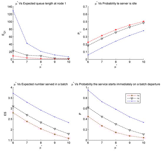 - Effect of the dependence of service rate on batch size in Scenario 1, on system characteristics: As can be seen from the above Table 8, when the service rate is directly proportional to the stage in which the process is in, the service rate is lowest when the batch size is maximum (for sub-scenario c, service rate is inversely proportional to batch size) (Ic), and this results in an increase in queue length at node 1, compared to other combinations of arrival and service processes (Ib and Ia). The server will be serving a bigger batch most of the time as indicated by values of (nearly 1, when ).