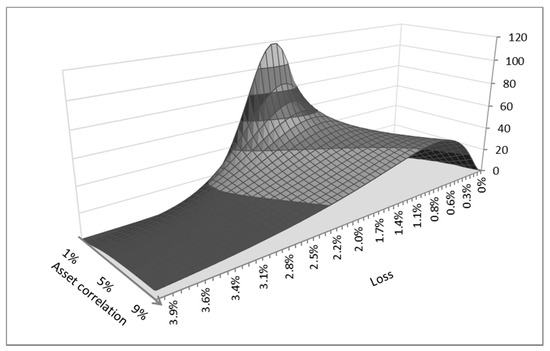 Hence, the shape of a distribution function depends on two elements, i.e., PD and . Figure 3 presents the impact of an asset correlation on the shape of the distribution function. For illustration purposes, the calculations were performed for expected loss equal to 2% and asset correlation ranging from 0% to 10%. It can be noticed that the distribution function becomes wider as the correlation grows. At the same time, the mode decreases while the expected value remains unchanged. Furthermore, the right tail of the distribution function gets fatter. Therefore, high values of losses are more likely to arise. The rationale for this is that the market factor becomes more critical once the correlation grows. Hence, we observe a reduction of the risk diversification effects resulting from independent idiosyncratic factors. Therefore, highly correlated borrowers may easily lead to enormous losses.