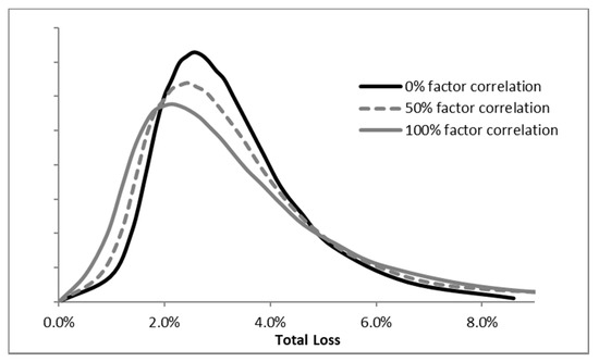 Under the Monte Carlo simulation, the following factor correlations were considered: 0%, 25%, 50%, 75%, and 100%. Figure 4 presents overall loss distribution functions derived for three selected market factor correlations (0%, 50%, 100%). It can be noticed that lower correlation makes the distribution function narrower. Hence, the unexpected loss (e.g., VaR999) gets higher when correlation rises. This finding is quite obvious, as a positive correlation weakens the portfolio diversification effect.