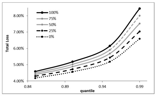 Table 2 presents overall losses calculated under Monte Carlo simulations. The market factors’ correlation ranges from 0% to 100%, with steps of 25%. Overall losses were calculated for the following quantiles: 0.8, 0.85, 0.9, 0.95, and 0.99. It can be noticed that overall loss corresponding to quantile 0.99 rises by around 0.5% once correlation increases by 25%. Moreover, unexpected loss (VaR99) for correlation equal to 0% was estimated at 6.6%, while for correlation equal to 100%, the loss increased up to 8.4%.