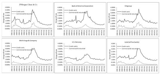 This section presents the results of the analysis conducted for five leading US banks. The credit losses were calculated based on data sourced from the FR Y-9C reports (The data were downloaded from the web page: (https://www.chicagofed.org/webpages/banking/financial_institution_reports/bhc_data.cfm (accessed on 10 February 2021)). These reports are published quarterly and publicly disclosed for the United States Bank Holding Companies (BHCs). It incorporates almost two thousand database fields for each bank, including charge-offs, recoveries, outstanding values, and various product breakdowns. Currently, all BHCs with total consolidated assets above 50 billion USD are obliged to submit data every quarter. The data has been collected since 1986, and during the last 30 years, the scope has been changed multiple times, becoming more and more granular.