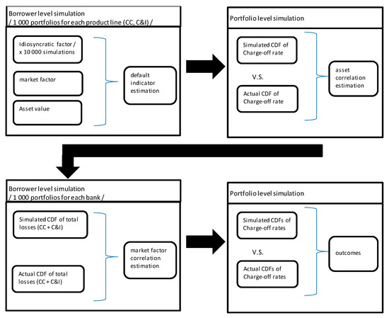 Next, a Monte Carlo simulation method was used for the one-factor model and the model with macro-factors correlation. Under the exercise, two portfolios for each bank were simulated. The simulation was performed at the borrower level, where idiosyncratic and market factors were randomly generated. Asset correlation was then estimated by finding the minimum value of Kolmogorov–Smirnov statistics calculated for actual and theoretical distribution functions. In other words, the best fit between theoretical and actual cumulative distribution functions indicated asset correlation.