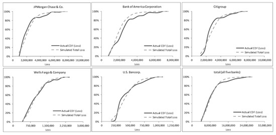 Figure 9 presents distribution functions (empirical vs. theoretical) of total nominal losses derived using the correlation between market factors. The dotted lines represent theoretical distribution functions, while the solid lines represent the actual distribution functions. The actual distribution functions were calculated based on historical charge-off rates applied for the most recent outstanding values (2017Q2). This way, nominal losses were calculated in line with the CCAR methodology. All six examples show that distribution functions (actual and simulated) are close to each other, ensuring high model performance. Later on, the results were verified with Kolmogorov–Smirnov test.