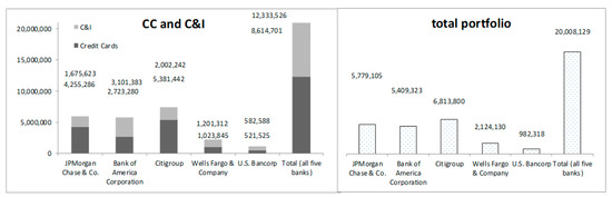 For the analysis, there were two types of portfolios considered, i.e., (I) credit cards and (II) commercial and industrial loans. The data were downloaded for five leading US banks, including JPMorgan Chase and Co., Bank of America Corporation, Citigroup, Wells Fargo and Company, and US Bancorp. These banks were selected due to their global span and the scale of activity measured by their assets’ value. Finally, an enhanced approach with market factors’ correlation was applied.