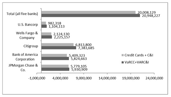 This research proved that the correlation between market factors relating to credit cards and commercial and industrial loan portfolios may vary across different banks. In Bank of America Corporation, JP Morgan, and Citigroup, correlations were found to be relatively low. For this reason, the total loss distribution functions are expected to be relatively narrow. The market factors’ correlations at the level close to one (e.g., Wells Fargo—98%) revealed no unexpected loss overestimation effect while using the traditional additive approach for VaRs. This research also proved that the asset correlation estimated for commercial and industrial loans is much higher than the asset correlation for credit cards. This finding is in line with other papers [15], showing (Table 5) that correlations for C&I portfolios can reach 6.0%, while credit cards oscillate around 1.5%.