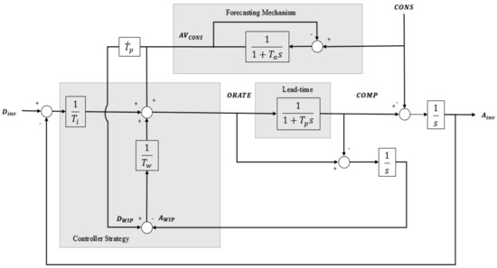 Among these models and/or methods, control theory with feedback mechanisms has become a popular choice to analyze and simulate production–inventory systems through different mathematical tools, such as Laplace transforms, Z-transforms, transfer functions, block diagrams and frequency analysis, and numerous studies have been conducted in this space [8,9,10,11,12]. The inventory and order based production control system (IOBPCS) model proposed by Towill [13] has been recognized as a common framework for modeling the control of a production–inventory system. John et al. [14] made an important extension to the IOBPCS model by including the work-in-process (WIP) feedback and proposed the automatic pipeline, inventory, and order based production control system (APIOBPCS) model, which has been widely used for modelling production–inventory systems since then [15,16,17,18,19].