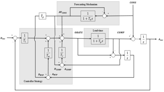 The 2APIOBPCS model [21] shown in Figure 2 has the similar structure to the APIOBPCS model, with an additional feedback loop using the fraction 1/Tc of the difference between the desired completion production rates DCOMP and the actual completion production rates ACOMP as an extra control for the production–inventory system. Tc is a constant time for the completion rate (COMP) for proportional control.