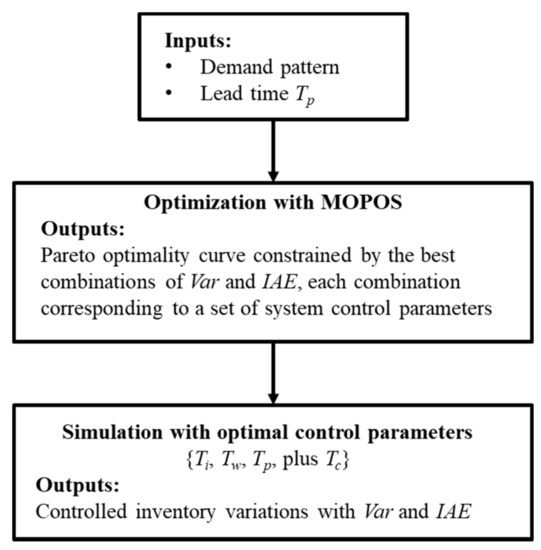 Simulations of a production–inventory system used to be conducted using some sets of input parameters mainly based on the practitioner’s experience in operating similar systems. The best values for the control parameters among the different sets of simulation outcomes are then determined by comparing the statistical results of these outcomes. The inputs must of course be reset for simulating a new system. By introducing a designated MOPSO algorithm into simulation using the APIOBPCS model [22], once feeding the demand pattern and production lead time to the system, the automatic simulation process can produce a set of control parameters (Ti, Tw and Ta), in which each set can achieve the best balance between the variance ratio (Var) and the integral of absolute error (IAE), in other words, between the bullwhip effect (cost-effectiveness for the industry) and CSL or customer satisfaction. These sets of control parameters are usually presented as a Pareto optimality curve, in which the system manager can choose any desired set on the curve as the best control parameters.