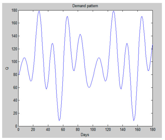 Since the demand pattern can vary largely, following the common practices in simulation of production–inventory systems, we choose a variable sinusoidal pattern as shown in Figure 4 to represent the random nature of demand to some extent. Other variables are assigned the values used in various published works in production–inventory simulations [8,13,14,17,18,19,24,25,26]. The major assumptions in all our simulations are as follows.