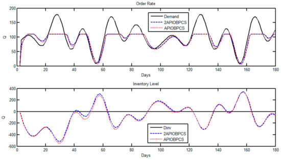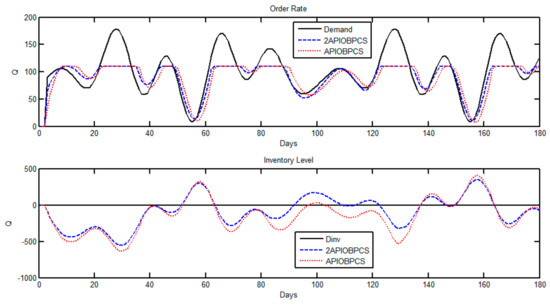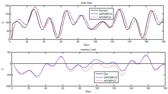Simulation of Case 2 using Set 2 for the APIOBPCS and 2APIOBPCS models. Order rate (top) and inventory level (bottom).