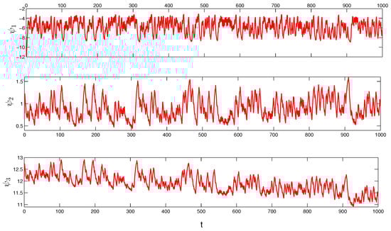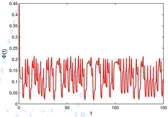 We can see that the conditions (C1)–(C8) are valid for the neural network (16) with for , and moreover, , . If we accept , then the system (16) satisfies all conditions of Theorem 1. Therefore, (16) has a unique exponentially stable unpredictable solution
