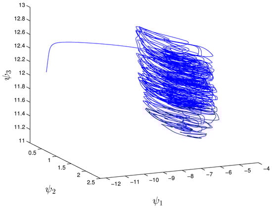 The graph of function approaches the unpredictable solution of Equation (16), as time increases. That is, instead of the curve describing the unpredictable solution, one can consider the graph of . We present the coordinates of the solution in Figure 3. Moreover, Figure 4 indicates the trajectory of the solution.