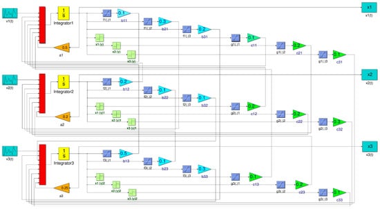 Further, we describe a circuit implementation of the proposed Hopfield-type neural network (16) using MATLAB Simulink. The Simulink model of the Hopfield-type neural network is depicted in Figure 5, and the symbols are described in Table 2.