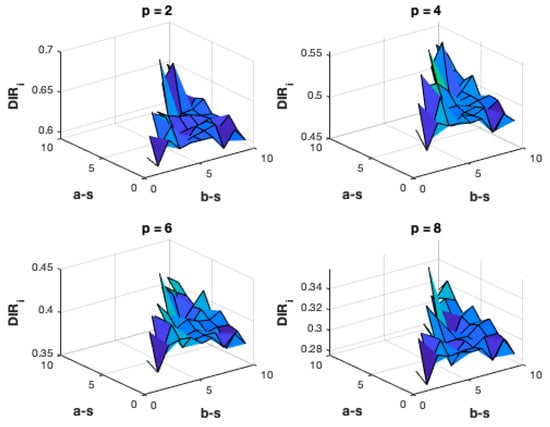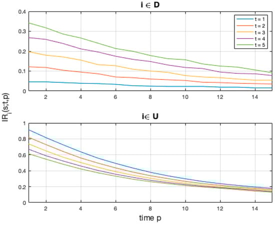 In Figure 3, we show the Duration Dependent Interval Reliability for some fixed values of parameters. Specifically, we set and let change possible values of the forward interval and selected four different values of . Also, in this case, we can see that the probability is higher for lower values of , another important feature is that the probability does depend on the forward time in the interval .