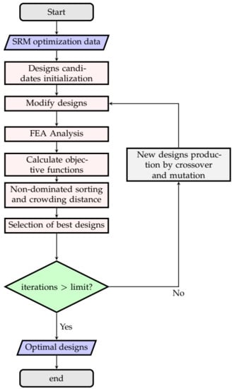 The code is made using the Lua programming language. The code is executed using Lua Console in FEMM4.2 software. The choice of the Lua programming language to be used is due to its simplicity and that it is adopted by FEMM4.2, which provides the FEA analysis in good accuracy. The code’s algorithm is shown in Figure 3. First, SRM optimization data are entered. These data include the population size, problem variables, variables limits, objective functions, to specify which objective function to maximize and which to minimize the maximum iterations limit and numbers of rotor and stator poles ( and ). Then, solutions are initialized by random choice of variables within the search space area. After that, constraints in Equations (26)–(29) are maintained in this step by changing the values of variables resulted. Then, the FEA is accomplished using FEMM4.2 software to calculate average torque, maximum stator and rotor poles flux densities and volume of iron. After that, the results of FEA analysis is used to calculate the remaining objective functions ( and ). Then, non-dominated sorting is performed and crowding distance is calculated for all solutions. Next, the selection of the best designs to be used in crossover and mutation. Lastly, termination condition is checked such that if number of iterations exceeds the maximum limit the whole process is finished and the highest rank of all solutions (non-dominated front) is the given in the output of optimization process.