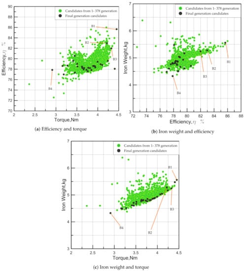 These figures show the search direction or the optimization progress as more generations are produced. As we intended to maximize both average torque and efficiency and minimize iron weight, it is obvious that the crowded area (which indicates the majority of search) in Figure 4a, for example, exists in the upper right quarter (considering the axes limits). Wherein, higher values for both efficiency and average torque are sought. This means that the optimization program has searched a lot in the area of variables that produce candidates with more average torque and efficiency in the same time. Figure 4b shows the same concept with the difference that the objective functions are iron weight and efficiency. The program tries to minimize iron weight while maximizing efficiency but because of the complexity of the problem and the constraints, results have a unique shape. The program tries to achieve better candidates by searching right or left of the crowded area. The same goes for Figure 4c, replacing the efficiency in Figure 4b with average torque. For 6/4 SRM, the results represented by Figure 5 show the same features of optimization as in 8/6 SRM. Figure 6 shows the candidates of final generation with the three objective functions. The results shown confirm the accuracy of the search direction. Moreover, it indicates the diversification of the method used as it shows variety in objective functions’ values.