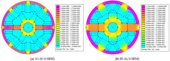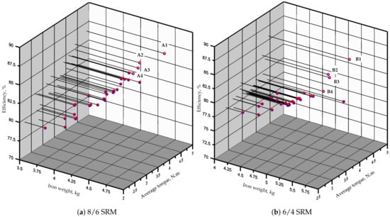 Table 4 shows the best selected candidates among the first non-dominated front (also known as rank 1). Four candidates are selected for each configuration (set A for 8/6 SRM and B for 6/4 SRM). A1 and B1 achieve the maximum values of average torque and efficiency among the final generation candidates. A4 and B4 achieve the minimum iron weight. A2, A3, B2 and B3 are compromise designs, which satisfy each objective function in a certain degree. A1 and B1 designs are selected from these candidates for further investigation. All designs of the selected sets in Table 4 are shown in Figure 4, Figure 5 and Figure 6. The values of objective functions, parameters, dimensions and other details for selected sets are shown in Table 5. From Table 5, it can be seen that the variation of dimensions to produce better designs matches with the SRM design experience, which indicate the accuracy of calculation methods. For example, the difference between aligned inductance () and unaligned inductance () is higher in designs of higher average torque. This result matches with design experience as the energy conversion increases with higher difference of flux level between aligned and unaligned positions. This is indicated by Equation (12). Other important observations indicated in Table 5 should be highlighted and they are: