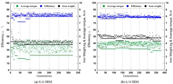 The progress of optimization with generations for both 8/6 SRM and 6/4 SRM is shown in Figure 7. It can be seen that average torque and efficiency are maximized as more generations are produced and the iron weight is minimized at the same time.
