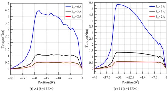 Further investigations are made on the selected designs A1 and B1. The torque is shown in Figure 8 for constant phase current from an unaligned position to aligned positions for selected optimal designs. Note that the peak torque for B1 (6/4 SRM) is higher than that of A1 (8/6 SRM) due to the higher difference between aligned and unaligned inductances in 6/4 SRM. However, the average value of A1 (8/6 SRM) torque is higher than that of B1 (6/4 SRM) due to the increased number of phases in 8/6 SRM configurations.