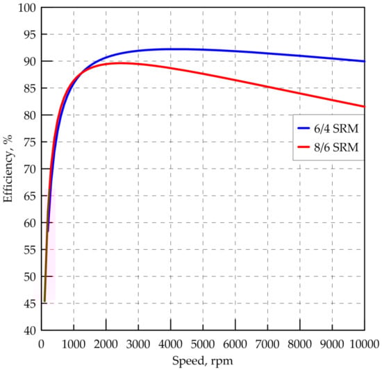 Efficiency of selected optimal designs A1 (8/6 SRM) and B1 (6/4 SRM) at different speeds.