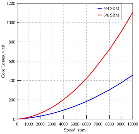 Core losses of selected optimal designs A1 (8/6 SRM) and B1 (6/4 SRM) at different speeds.