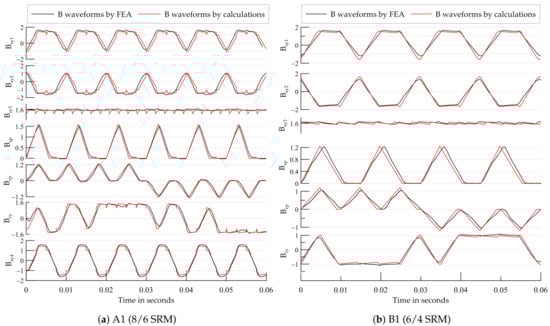 In Figure 10, the efficiency of optimal selected designs for a range of speeds up to 10th of rated speed is shown. It can be seen that the values of efficiency for selected optimal designs are almost identical to the value of speed before 1300 rpm. This result is due to the lower core losses in this region as shown in Figure 11. The program was given the rated speed of 1000 rpm to calculate core losses and efficiency and then seek better values at same speed. It can also be seen that 6/4 SRM has a better efficiency profile than 8/6 SRM over a wide speed range, which is expected due to higher core loss values as demonstrated in [14]. SRM with 8/6 configuration has a higher number of poles than 6/4 SRM and hence flux changes are higher, which leads to core losses. Figure 11 shows the core losses of 8/6 SRM is much higher than that of 6/4 SRM. Figure 12 shows a comparison between calculated and FEA waveforms of flux density (B) of all sectors for the chosen optimal designs. It can be seen that the results of the calculation are very close to FEA waveforms. The calculation method is used to produce flux density (B) waveforms and to then calculate eddy currents losses as introduced in Section 2.8.