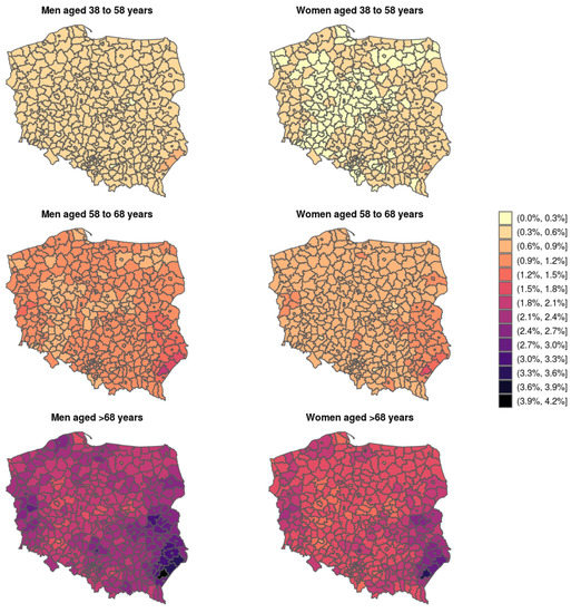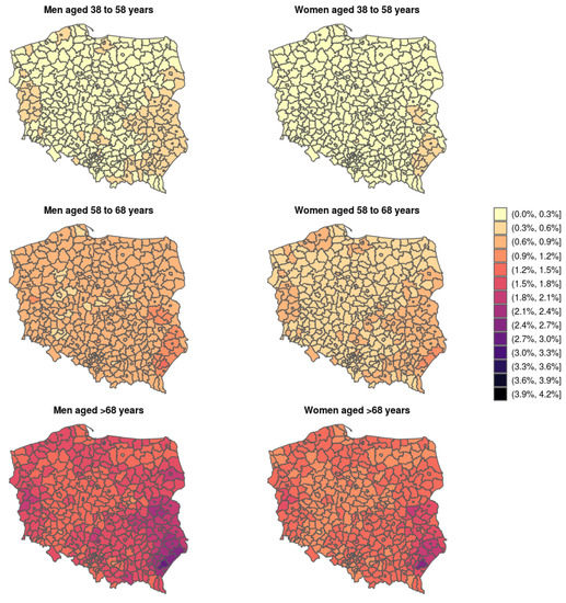 The potential of the models analyzed is enormous because they allow us to study and visualize the outcomes of interest in relation to the population subgroups defined by the different values of the covariates. This information is too long to be included in this article. By way of illustration, we present in Figure 2 the posterior expectation of the probability of stroke, by gender and age group, for people who did not take any medication, obtained from the spatial logistic regression model. It is clearly visible that the probability of stroke increases with age and in general women have lower probability than men. The largest difference between the estimated values is in the oldest age group. The spatial pattern is very relevant. In the southeast of Poland (Podkarpackie and Lubelskie Voivodeship) there is a visible spatial cluster with the highest risk of stroke. Among the ten powiats with the lowest estimated probabilities of stroke, nine of them are cities including Wroclaw, Cracow and the capital Warsaw. Similarly, and in accordance with the illustrative objective, Figure 3 shows the posterior probabilities of stroke by gender and age group for people who takes drugs for the cardiovascular system (ATC C). The overall pattern shows higher probabilities of stroke than in Figure 2 due to the effect associated with these drugs (and the underlying condition, i.e., cardiovascular diseases).