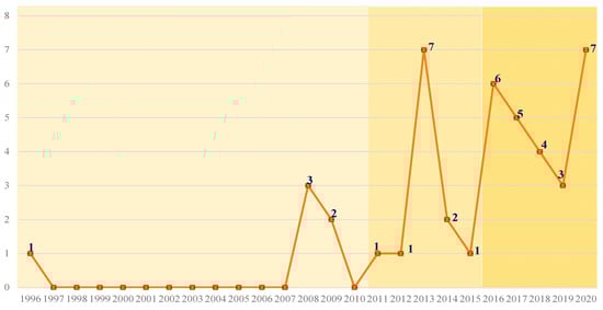 Figure 3 illustrates the number of AIME publications in each year from 1996 to 2020. Based on the suggestions of several previous studies to take into account the fluctuation of technology [16,36,38], the AIME studies are categorized into three time periods, that is, 1996–2010, 2011–2015 and 2016–2020. Accordingly, there are six publications from 1996 to 2010, 12 from 2011 to 2015 and 25 published papers from 2016 to 2020, as shown in Figure 3. It was found that the number of publications in the latter two periods was nearly twice that of the previous time period, showing the rapid growth of AIME research in the past decade. This finding could be related to the advancement of computer and AI technologies in the past 10 years.