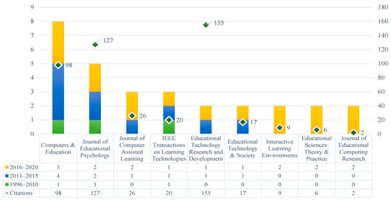 Figure 4 shows nine journals with the largest number of articles in AIME research between 1996 and 2020. They were Computers & Education (publications = 8), Journal of Educational Psychology (publications = 5), Journal of Computer Assisted Learning (publications = 3), IEEE Transactions on Learning Technologies (publications = 3), Educational Technology Research and Development (publications = 2), Educational Technology & Society (publications = 2), Interactive Learning Environments (publications = 2), Educational Sciences: Theory & Practice (publications = 2) and Journal of Educational Computing Research (publications = 2). It also shows that the most cited journals are Educational Technology & Society (citations = 155), Journal of Educational Psychology (citations = 127) and Computers & Education (citations = 98).