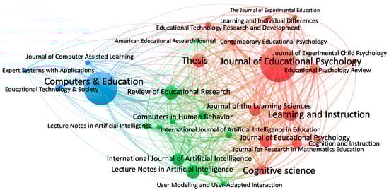 In addition, co-citation analysis and cited sources were selected. The minimum number of citations from sources was adjusted to 10, and the number of sources to be selected was automatically displayed as 30. Figure 5 shows that the top three most cited journals are Journal of Educational Psychology (79 co-citations), Computers & Education (72 co-citations) and Learning and Instruction (34 co-citations).