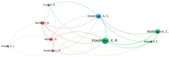 Figure 6 shows the co-citation analysis results by setting the minimum number of citations as 10. It was found that the publications by Koedinger (30 citations), Graesser (23 citations) and Walkington (22 citations) have been co-cited the most in AIME research.