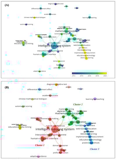 Figure 7B shows three main clusters of AIME research, that is, “AI-based learning systems”, “personalized/adaptive learning” and “learning strategies/models”, as displayed in red, green and blue. The studies in Cluster 1 (i.e., AI-based learning systems) focus on the development and applications of AI technologies and ITS to improve students’ learning performances. Among the three clusters, Cluster 1 includes the earliest AIME research. For example, Bennett and Sebrechts [42] evaluated the accuracy of the automatic qualitative judgments generated by an expert system in diagnosing students’ problems when learning algebra. Cluster 2 focuses on providing personalized/adaptive learning environments using AI technologies. For example, Wang et al. [43] demonstrated an adaptive learning system which can provide personalized learning content based on individual students’ learning statuses to increase their learning gains. Cluster 3 focuses on incorporating various learning strategies into AI-supported learning environments to improve students’ learning outcomes in mathematics courses. For example, Jiménez-Hernández et al. [44] proposed a gamification approach in an AIME learning environment to enhance the students’ learning motivation and achievement.
