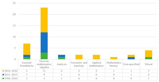 Figure 8 shows the number of application domains in individual time periods. It was found that the most frequent applications of AIME are discrete mathematics/algebra (53.49%), followed by general/foundations (16.28%) and mixed (9.30%). Moreover, the number of individual applications generally increased, and the application domains became more diverse from the first to the third time periods.