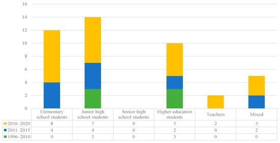 - Research sample groups: by referring to Hsu et al. [35], the research sample groups in the literature were categorized into elementary school students, junior high school students, higher education students, teachers, mixed groups and non-specified.