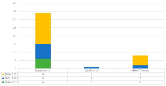 - Research methods: by referring to the coding scheme of Hsu et al. [35], the research methods were divided into quantitative, qualitative and mixed methods.