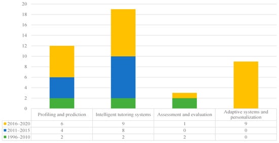 As for the role “adaptive systems and personalization”, the relevant studies were published in 2016–2020 to provide personalized guidance or supports to almost all levels of students (i.e., elementary school, junior high school and higher education) via analyzing their learning status and behaviors (e.g., [43,53,54,55]). It was also found that these “adaptive systems and personalization” studies seldom refer to the diagnosis of students’ learning problems for providing proactive personal guidance.