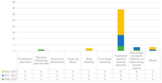 Figure 13 shows the adopted AI algorithms. It was found that most studies adopted the traditional machine learning approach (79.07%), followed by knowledge elicitation methods via interviewing domain experts (6.98%), mixed (6.98%) and deep learning (4.65%), while evolutionary algorithms, search and optimization, fuzzy set theory and case-based reasoning were not adopted in the studies.
