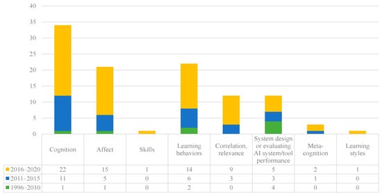 Figure 14 shows the number of different research issues investigated in the AIME research. It should be noted that generally two or more research issues were investigated in each study. The analysis results show that the issues related to cognition were investigated the most (34 articles), followed by learning behaviors (22 articles) and affect (21 articles). It was also found that the research issues became more diverse from the first time period to the third. For example, in the third time period, the issues related to skill (e.g., [56]), meta-cognition (e.g., [57]) and learning styles (e.g., [54]) were included.