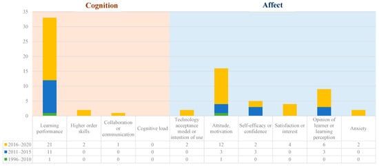 Figure 15 further shows the cognition and affect issues investigated in the AIME research. In terms of cognition, most studies measured students’ learning performances (33 articles), while few considered students’ higher order skills (2 articles) or collaboration or communication (1 article). Moreover, none of the studies investigated students’ cognitive load. In terms of affect, most studies investigated the students’ attitude or motivation (16 articles), followed by learning perceptions (9 articles), self-efficacy (5 articles) and satisfaction (4 articles).