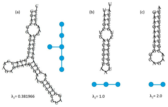 Example 3: Let be a linear tree on n vertices, n > 2, and be a linear tree on n − 1 vertices. Then a() > a(), since a linear tree that is shortened becomes more compact. Thus, the range of possible algebraic connectivity values for a tree T on n − 1 vertices, between the lowest value a() and the highest value of one, is smaller than the range of algebraic connectivity values for a tree T on n vertices, with the lowest value a() and the same highest value of the upper bound one. Various virusoid sequences that are linear in their secondary structure, as in Figure 3 of [22], illustrate this point because their tree graph is linear but associated with a different number of vertices. Their algebraic connectivity can be calculated using the formula a(T) = , mentioned in property (C) above. It is worthwhile noting that for the special case of n = 3, a() = 1 because the tree can only assume a single shape that is a star, and a() = 2 corresponds to two vertices because of the properties of the Laplacian operator when the grid is reduced to only two points. In addition, there is a noticeable similarity between property (C) and the eigenvalues of a tridiagonal Toeplitz matrix (40) because the Laplacian of an open path is tridiagonal Toeplitz except the first and last row, corresponding to the start and end vertices.
