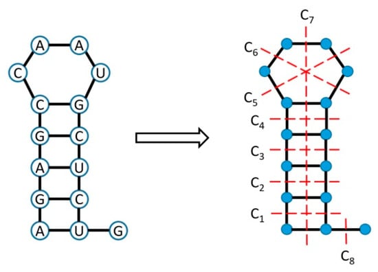 A simple RNA secondary structure drawn as described above and its graph representation are shown in Figure 2. An elementary cut, similar to its introduction for benzenoid hydrocarbons, is defined as follows. Select an edge e of the RNA graph representation, drawing a straight line through the center of e and orthogonal on e. The line will intersect the perimeter in two points and . The straight-line segment C whose end points are and is the elementary cut, intersecting the edge e. This line C intersects all edges that lie between and , including the two edges on the perimeter to which and belong. Elementary cuts for an RNA graph are depicted in Figure 2. The interested reader is referred to [34] for additional information.