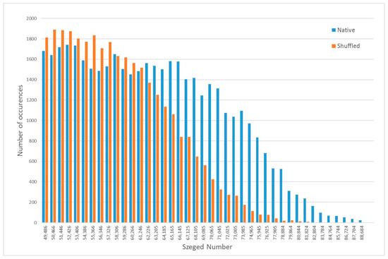The distribution of the Szeged numbers in our dataset is presented in Figure 3 and Figure 4, where for each native sequence a shuffled sequence is generated, and for both the Szeged index is calculated without considering multi-branch loops (multi-branch loops are discarded, as noted in [34], because such RNA structural motifs are too complicated to be analyzed by their Szeged index and it is sufficient to analyze them by their algebraic connectivity to examine their topology). The comparison between native and shuffled sequences will be discussed in Section 4. Shuffling is simply done without additional constraints such as maintaining dinucleotides or codons. The separation into the first 50 bins corresponding to the lowest Szeged numbers (Figure 3) and the last 50 bins corresponding to the highest Szeged numbers (Figure 4) is purposely done for convenience in the examination of the distribution that is obtained. The reported p-values in the captions were calculated from a T-test to check that the average Szeged values of the structures of native sequences were significantly larger than the Szeged values of the structures of shuffled sequences.