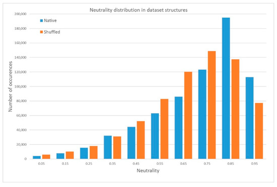 The neutrality distribution of all structures from our dataset comparing native and shuffled sequences. Reported p-value (see text) is less than 0.0001.