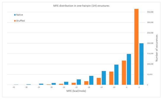 Finally, to conclude the analysis, it is worthwhile verifying that the native sequences are more mutationally robust and more thermodynamically stable than their corresponding shuffled sequences, as expected given that our dataset contains natural RNAs. Equation (12) is used to calculate the neutrality and in all of the calculations, RNAfold of the ViennaRNA Package 2.0 [15] is used for RNA structure prediction by energy minimization. Figure 5 depicts the neutrality distribution of native and shuffled sequences for all structures in the dataset, having used Python’s multiprocessing module (“process” class) to speed up the calculation. Figure 6 and Figure 7 depict the mean free energy (MFE) distribution for all one-hairpin (1H) structures and for all two-hairpin (2H) structures, respectively, covering the entire dataset. The reported p-values in the captions were calculated from a T-test to check that the average neutrality values of the structures of native sequences were significantly larger than the average neutrality values of the structures of shuffled sequences and the average MFE values of the structures of native sequences were significantly smaller than the average MFE values of the structures of shuffled sequences, respectively.